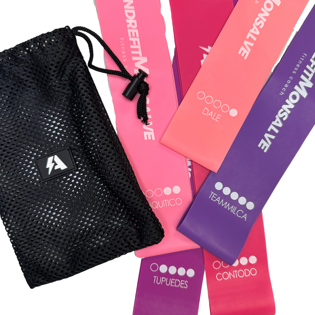 El conjunto incluye cinco bandas de ejercicio con niveles de resistencia codificados con mis frases motivadoras por excelencia, además de una práctica bolsa de viaje portátil.
